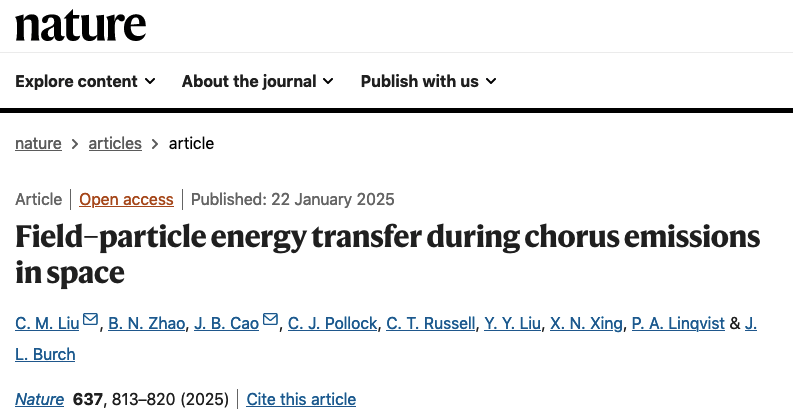 北航新闻网1月23日电(航宣)2025年1月23日,《Nature》期刊在线报道了北京欧美大片ppt免费大全空间与地球科学学院曹晋滨院士团队刘成明等人与来自美国和瑞典的科研人员,在地球空间合声(chorus)触发机制领域取得的最新进展:《Field-particle energy transfer during chorus emissions in space》。该工作打破了学术界关于合声波只能在地球偶极磁场控制的近地区域出现这一持续70多年的传统观点,首次发现在距离地球16万公里的非偶极磁场中性片区域也会出现合声波,其产生机制也与传统的合声波产生机制不同,来自于非线性波粒相互作用。刘成明副教授为第一作者,刘成明副教授、曹晋滨院士为通讯作者,北京欧美大片ppt免费大全空间与地球科学学院为第一单位。