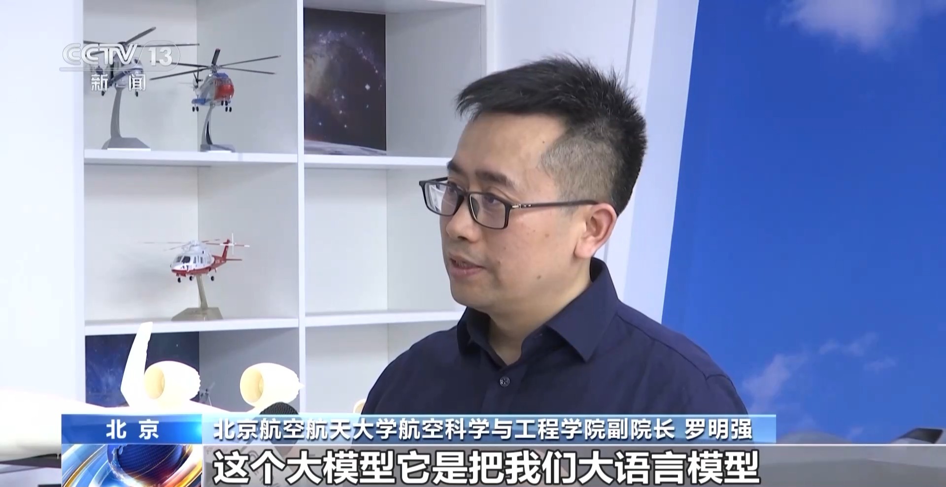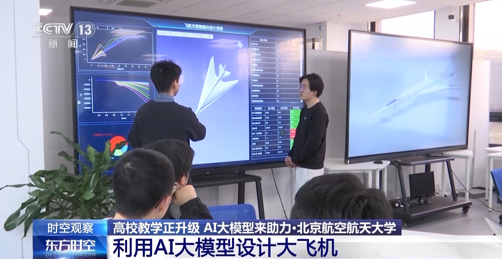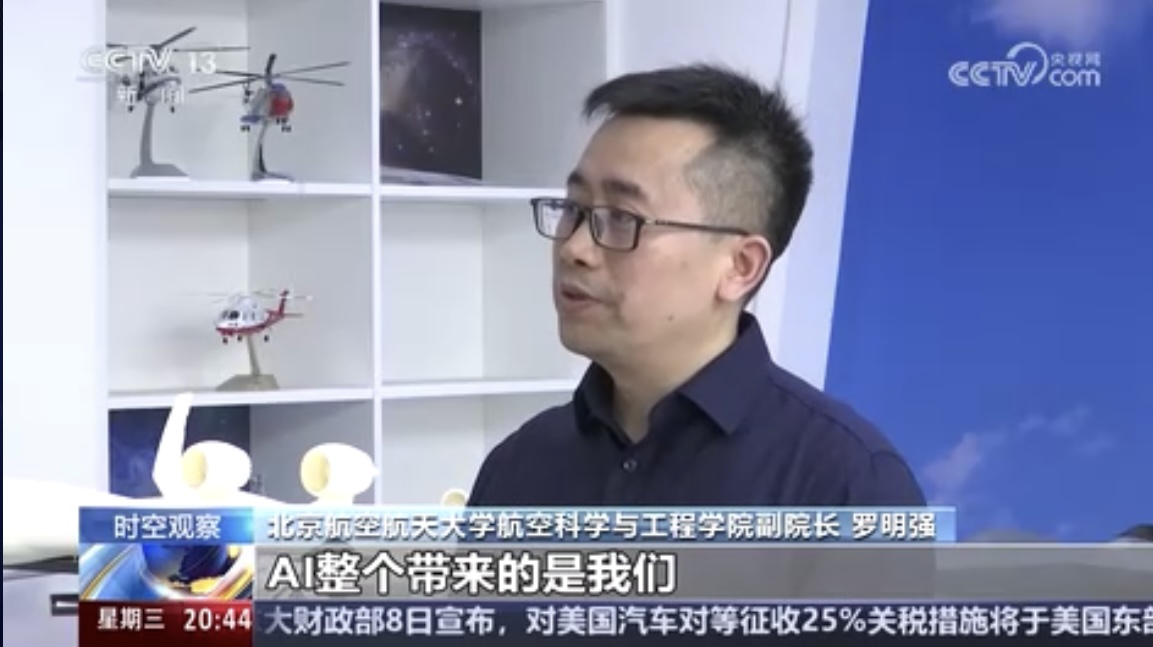 CCTV《东方时空》2025年4月9日报道北航利用AI赋能教学科研,聚焦北航利用AI大模型设计大飞机,采访我校航空科学与工程学院副院长罗明强、教务部副部长金天及部分学生:
