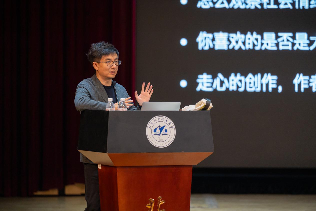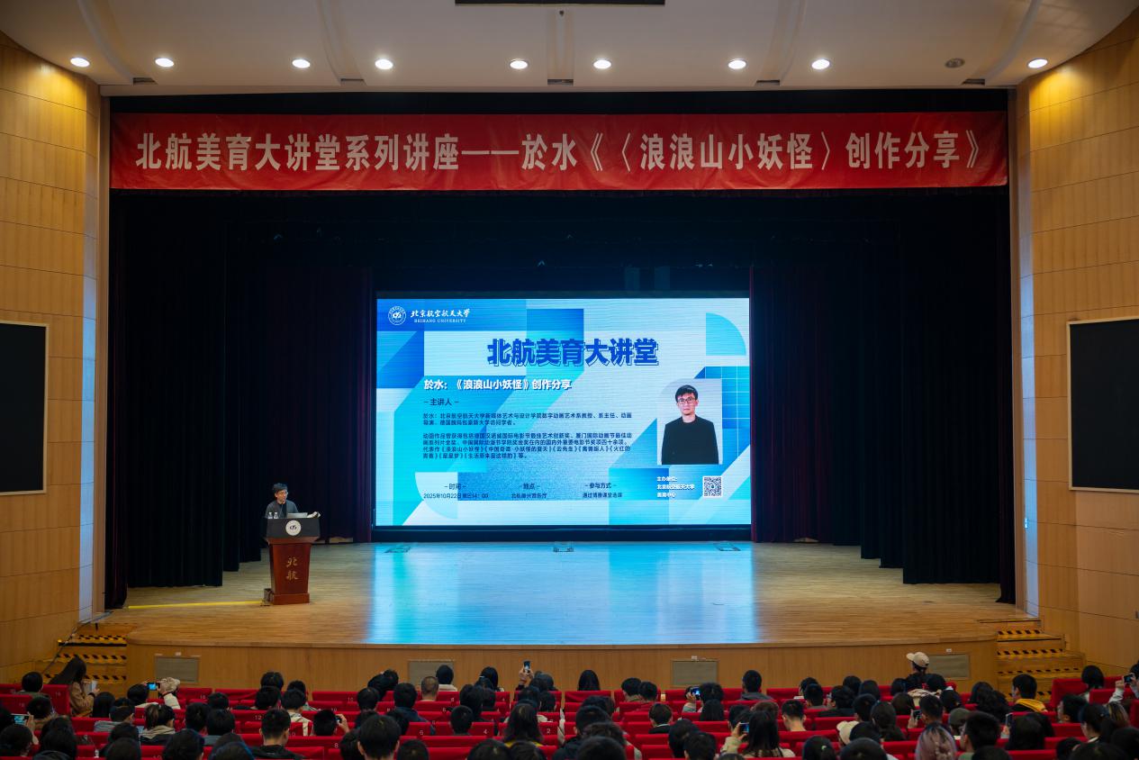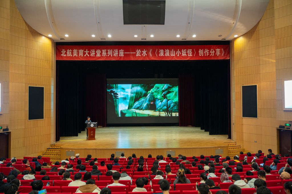 北航新闻网10月24日电(通讯员 高蕊 张宸瑶)为庆祝北航建校73周年暨沙河校区艺术馆开馆,10月22日下午,北航美育中心特邀新媒体艺术与设计学院数字动画艺术系教授、系主任、动画导演於水做客美育大讲堂,为师生带来开馆系列活动的第一场美育主题讲座“《浪浪山小妖怪》创作分享”。讲座由北航美育中心副主任宋泽惠主持。