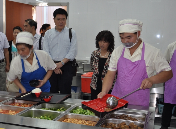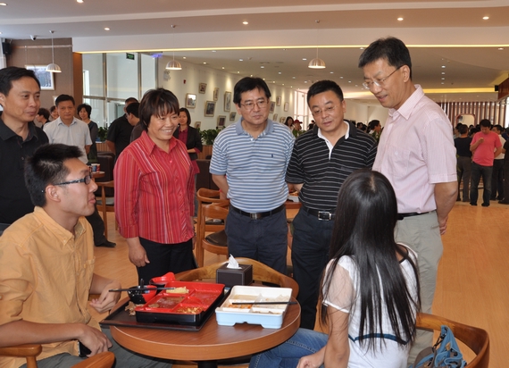 中午就餐高峰,怀进鹏校长视察了餐厅环境与布置,并走到“老北航”、“艺术墙”、“国际化”等主题就餐区与就餐同学进行现场交流,询问同学们对食堂菜肴质量、价格及服务态度等方面的看法,认真听取他们对学校工作的建议和意见。王建中副校长先后查看了食堂前厅和后厨的每个区域,亲身体验了从点餐到就餐的所有流程。怀校长最后提出,学三食堂在现有条件基础上,可充分开发内部空间的文化内涵,将学生用餐、休闲聚会、读书学习、研讨交流等多种功能融合在一起,适应大学生对用餐与交流环境的需要。
