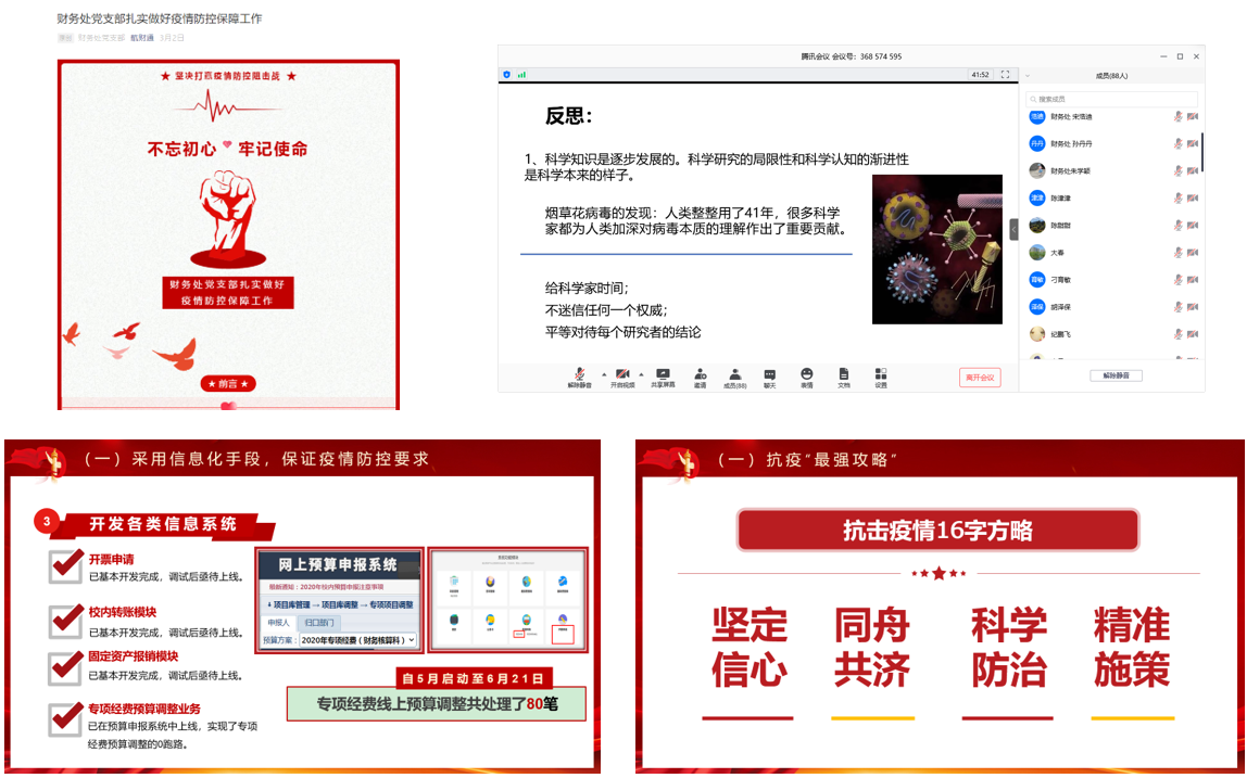 积极引导员工复工状态,感召党员融入学校未来发展,财务处党支部积极开展“战疫宣传季”系列活动,在活动中将个人发展、财务业务发展及学校综合发展有机融合,做好战疫时期宣传及财务长期服务的综合保障。