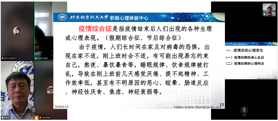 为更好引导教职工做好自我调适,积极理性应对疫情,在逐渐进入正常工作状态时,支部组织党群一道,联合规资处党支部参加《后疫情时期教职工的积极心态建设》主题党课,邀请学生心理咨询与发展辅导研究中心主任马喜亭副教授讲解。