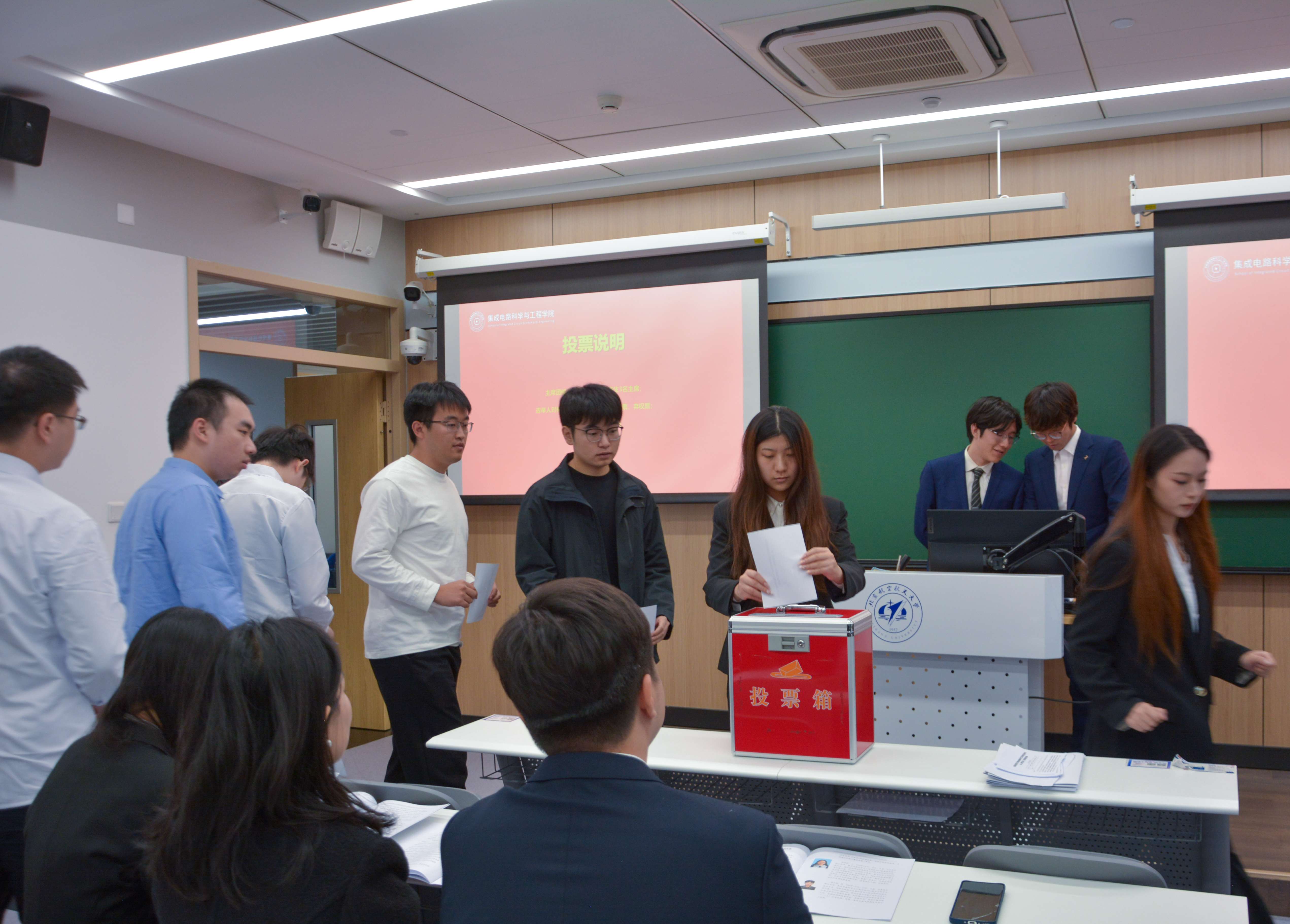 经无记名投票,监票人、计票人严谨履职,最终王赛雅、刘愈杰、张欣悦当选为集成电路科学与工程学院第五届研究生会主席团成员。