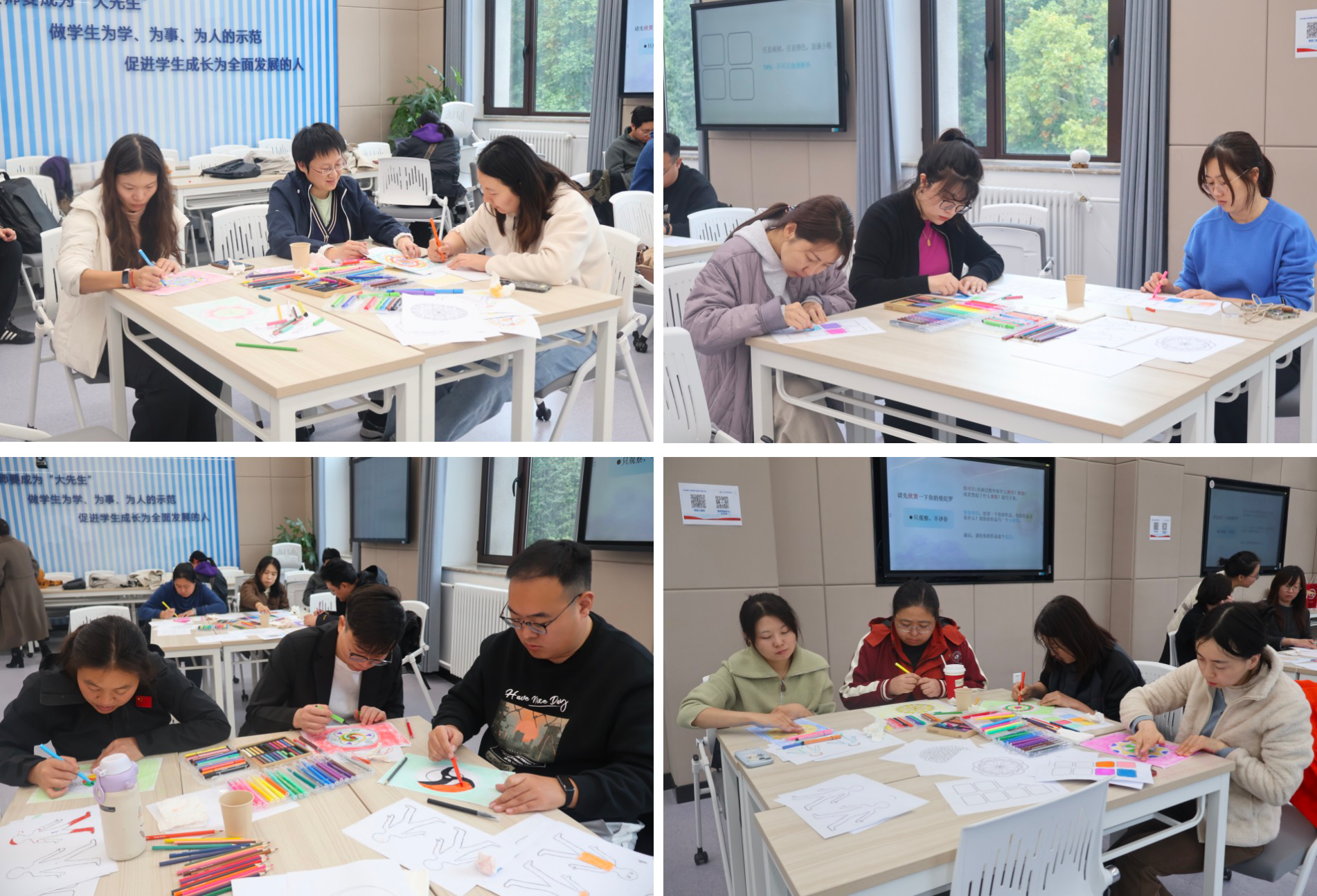 在实践环节,解婧通过循序渐进的引导,帮助教职工逐步“看见自己”。她带领大家冥想放松,鼓励老师们挑选经典曼陀罗图案进行自由创作,用画笔记录当下的内心感受。她同时建议大家,在工作之余预留与自我相处的时间,通过持续的自我观察与对话,保持身心的平和与活力。