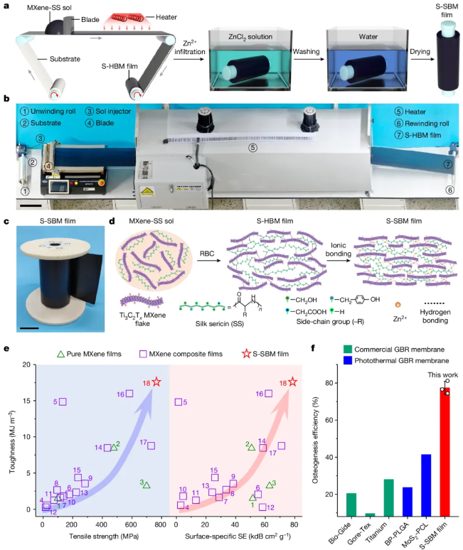为了进一步实现高性能二维纳米复合薄膜材料的连续化制备,该工作创新性地开发了卷对卷辅助刮涂结合有序界面交联的新策略。首先将MXene纳米片和丝胶蛋白(SS)混合溶胶通过卷对卷辅助刮涂,连续化组装成氢键交联MXene(S-HBM)薄膜;然后浸泡在氯化锌(ZnCl2)溶液中进行离子交联,从而规模化制备有序交联MXene(S-SBM)薄膜(图1a-d)。相比于文献报道的其他MXene薄膜材料,该SBM薄膜具有更高的拉伸强度(755MPa)、韧性(17.4 MJ m-3)和比电磁屏蔽性能(78,000 dB cm2 g-1)。此外,该SBM薄膜比商用引导骨再生(GBR)薄膜具有更高的体内成骨效率(8周新生骨体积分数高达77.4%),在临床骨修复领域具有重要应用前景。