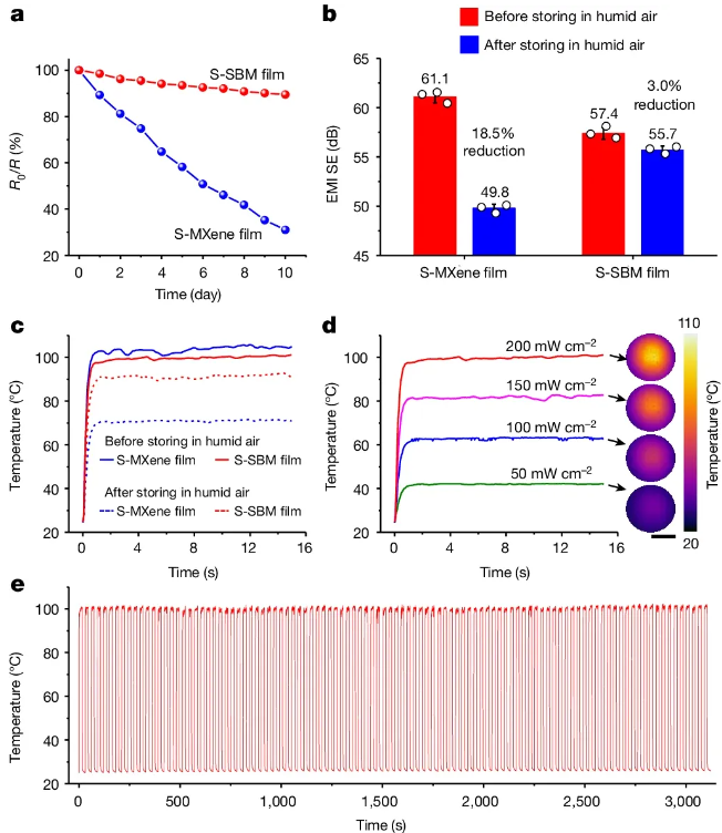 由于密实的结构可以阻止氧气和水分子渗入MXene纳米片层间,延缓氧化作用,因此在潮湿空气中,S-SBM薄膜相比S-MXene薄膜具有更稳定的导电(图3a)、电磁屏蔽(图3b)和光热转换(图3c)性能。此外,S-SBM薄膜的表面温度与红外光强呈正相关(图3d),且具有较好的光热转换稳定性(图3e)。