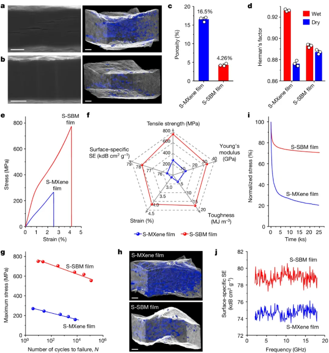 纳米X射线断层扫描三维重构结果表明,S-SBM薄膜相比未交联MXene(S-MXene)薄膜具有更小的孔隙率(图2a-c);广角X射线散射结果表明,S-SBM薄膜在干燥过程中可以更有效地保持湿态规整取向结构(图2d)。这些结果证实有序交联过程可以抑制MXene纳米片在干燥过程中的毛细收缩,从而规整密实组装MXene纳米片。由于较强的界面作用和规整密实的结构,S-SBM薄膜相比S-MXene薄膜具有更高的拉伸强度(755 ± 22 MPa,图2e、f)、杨氏模量(32.9 ± 1.9 GPa)、韧性(17.4 ± 0.5 MJ m-3)、耐疲劳(图2g)、抗应力松弛(图2i)以及电磁屏蔽性能(78,000 ± 800 dB cm2 g-1,图2j)。此外,对循环拉伸前后的MXene薄膜进行纳米X射线断层扫描三维重构(图2h),首次证实了有序界面交联作用可以大幅抑制二维纳米复合材料内的裂纹扩展。