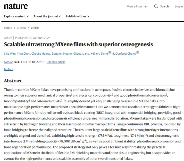 北航新闻网10月31日电 北京时间2024年10月31日,《Nature》杂志报道了北京欧美大片ppt免费大全化学学院程群峰教授课题组和北京大学口腔医学院邓旭亮教授课题组在二维纳米复合材料连续化制备及骨再生应用研究领域取得的最新进展:《Scalable ultrastrong MXene films with superior osteogenesis》,该工作开发了卷对卷辅助刮涂结合有序界面交联的新策略,实现了高性能MXene纳米复合薄膜材料的连续化制备,开辟了MXene纳米复合薄膜材料在骨再生领域的新应用。这项研究解决了高性能二维纳米复合材料连续化制备的长期挑战,为其他二维纳米材料的高性能规模化组装及应用研究提供了新思路【Nature, 2024, 634, 1103】。北京欧美大片ppt免费大全化学学院万思杰副教授、北京大学口腔医学院陈英副研究员为第一作者,北京欧美大片ppt免费大全化学学院程群峰教授、北京大学口腔医学院邓旭亮教授为通讯作者,北京欧美大片ppt免费大全化学学院为第一单位。