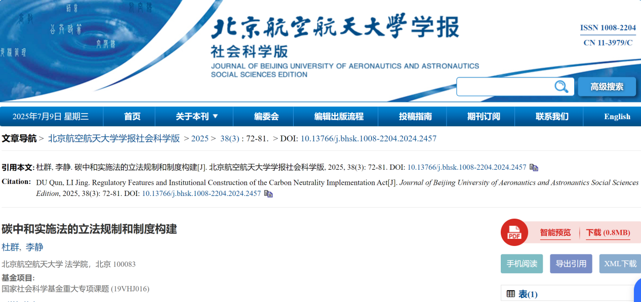 北航新闻网7月15日电(通讯员 张博珺)近日,北航法学院学术委员会主任、环境法经济法中心主任杜群教授和博士后研究人员李静在《北京欧美大片ppt免费大全学报(社会科学版)》2025年第3期发表《碳中和实施法的立法规制和制度构建》的论文,详细阐述制定和实施“碳中和实施法”推动气候公正转型的理论基础和制度对策。文章指出,在中国气候变化立法是以“应对气候变化法”还是“碳达峰碳中和法”为立法体例的问题上,应采取后者即直接指向碳减排、绿色低碳发展的“碳中和实施法”,在“目标-功能-规范”三个维度上构建“专门性-嵌合性-后果性”的制度体系。文章强调,碳中和实施法应将“促进经济社会绿色低碳转型的公正过渡”确立为立法目标,构建“绿色低碳公正过渡保障制度”。