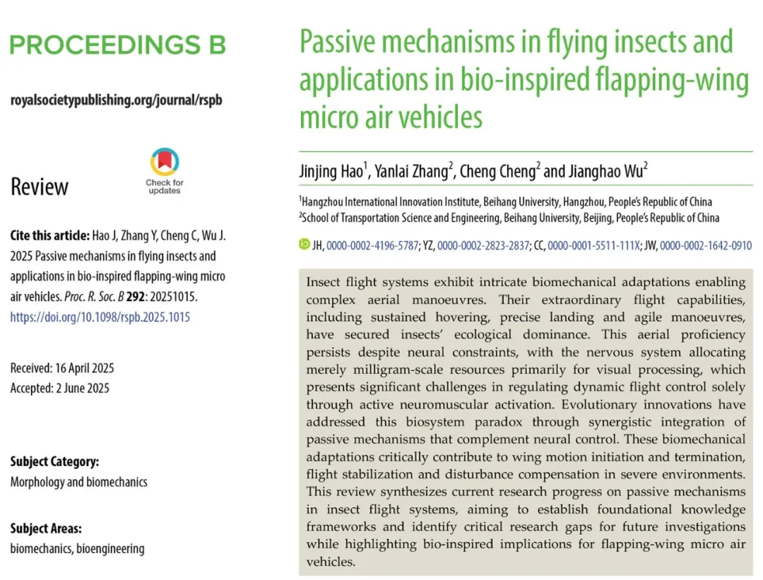北航新闻网7月19日电(通讯员 郝金晶)近日,北京欧美大片ppt免费大全研究团队在《皇家学会会报B辑》发表了题为“Passive mechanisms in flying insects and applications in bio-inspired flapping-wing micro air vehicles”的综述论文,该研究系统梳理了昆虫飞行系统中被动机制的研究进展,阐释了仿生原理如何启发工程设计,提出了昆虫飞行力学的关键未解之谜,为新一代微型飞行机器人的研发提供了重要思路。