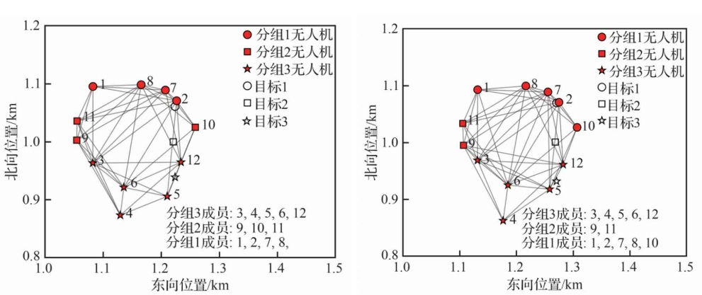 本文提出的方法可在目标跟踪过程中实现动态目标分配决策,可根据各目标的逃逸风险大小确定为各目标分配的无人机数目。在MATLAB仿真环境中,模拟由12架无人机组成的集群对3个地面移动目标进行跟踪。