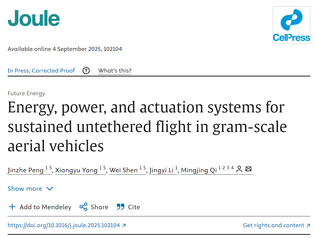 北航新闻网9月5日电(通讯员 彭谨哲)近日,能源与动力工程学院漆明净教授团队在《Joule》期刊Future Energy专栏发表题为《Energy, Power, and Actuation Systems for Sustained Untethered Flight in Gram-Scale Aerial Vehicles》的前沿文章。文章系统梳理了克级微型飞行器(Micro Aerial Vehicle, 以下简称MAV)的瓶颈与前沿突破,提出实现超长续航乃至“无限续航”的能量自持飞行理论,并展望了未来技术创新方向。