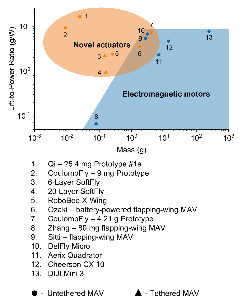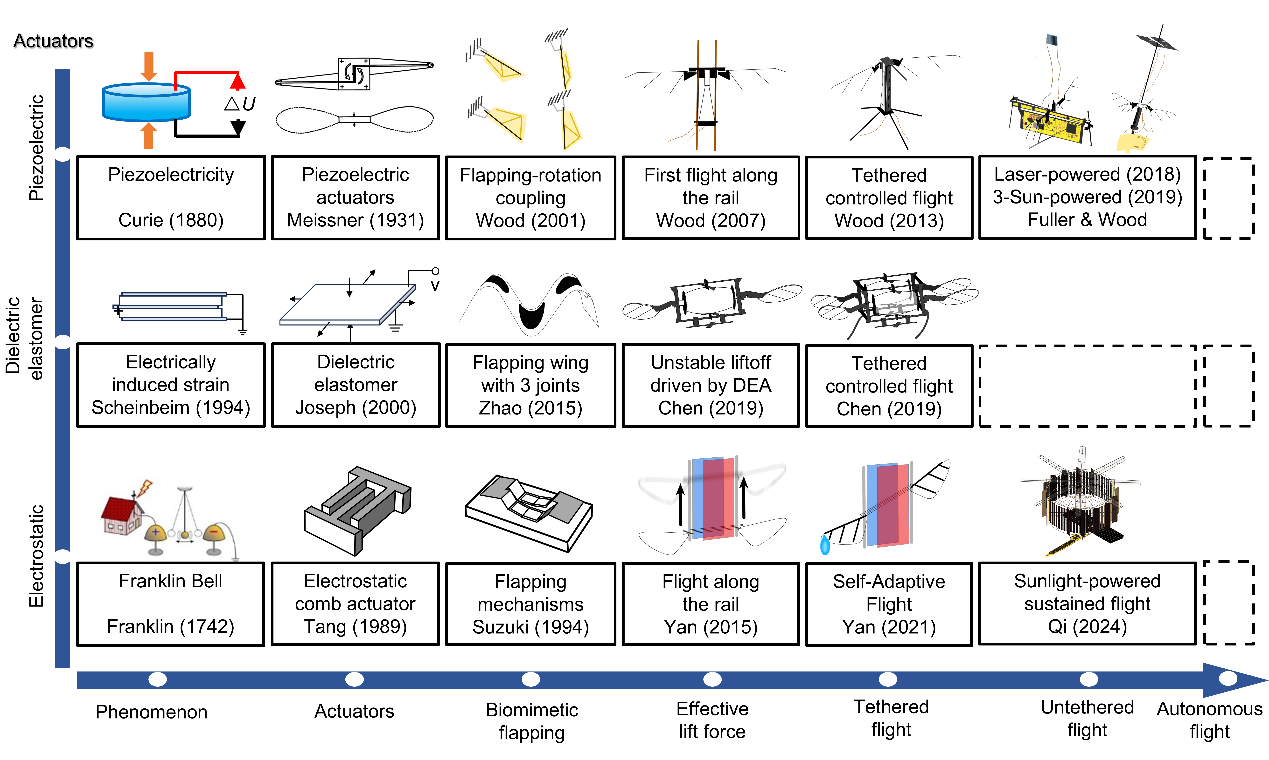 决定微型飞行器续航能力的主要因素在于力效(Lift-to-Power Ratio),即单位功率所能产生的升力。受尺寸定律、转子动力学与仿生驱动频率失配等因素影响,克级MAV难以通过提升锂电池能量密度或电机性能实现根本性突破。为此研究人员开发了压电驱动器、介电弹性体驱动器和静电驱动器等新型驱动器,能够在极小体积和质量下大幅提高力效和能量利用效率。