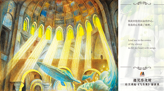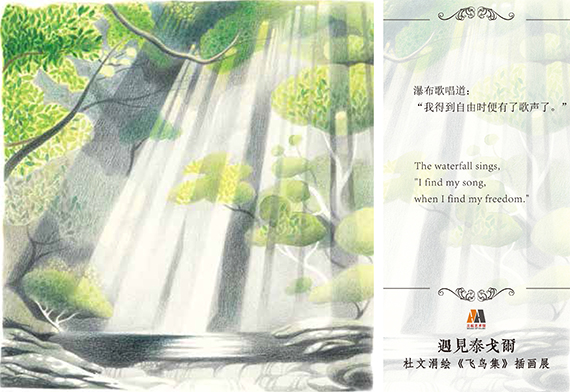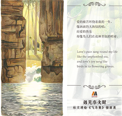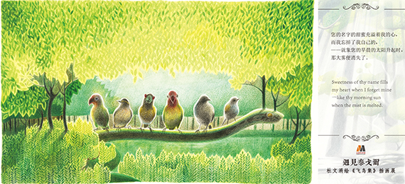 编者按:3月18日,由北航文化与艺术传播研究院、中国青年出版社联合主办的“遇见泰戈尔——杜文涓绘《飞鸟集》插画展”,在北航艺术馆展览大厅正式开展。本次展览系在中国青年出版社2015年3月刚刚隆重推出的彩绘精装、汉英对照新版泰戈尔《飞鸟集》的基础上,以诗歌与绘画艺术“联袂”展览的方式,传播世界经典文学名著的探索和尝试。展览共展出了青年艺术家杜文涓为《飞鸟集》专门创作的插画作品50幅,唯美不甜腻、从容不柔弱,自然澄澈、温暖流露,云淡风轻却恰到好处地勾勒、演绎出泰戈尔诗作的清新意蕴与深邃哲思。北航新闻网现分享“遇见泰戈尔——杜文涓绘《飞鸟集》插画展”作品选,以便各位近距离、多角度、全方面地感受经典文学及艺术作品带来的审美感受和心灵感应。