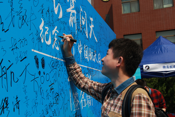 4月24日上午,作为首个“中国航天日”的系列庆祝活动之一, “航天梦•北航情”北航学生航天文化嘉年华在逸夫科技馆广场举行,受到校内外观众的广泛关注。活动由北航学生工作部、宇航学院主办,校学生会、宇航学院学生会、宇航协会、北斗巡星会等校内学生组织以多种形式展现北航学子的航天特色和航天精神。令人目不暇接的各种航天展品及图文吸引了众多北航师生及校外观众前来参观体验。