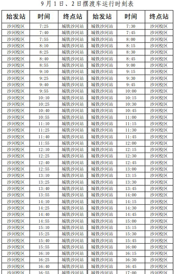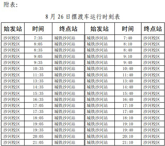 为服务2014级新生报到,沙河校区于8月26日、9月1日、9月2日安排校区至地铁站间临时摆渡车,具体运行时刻请见附表。