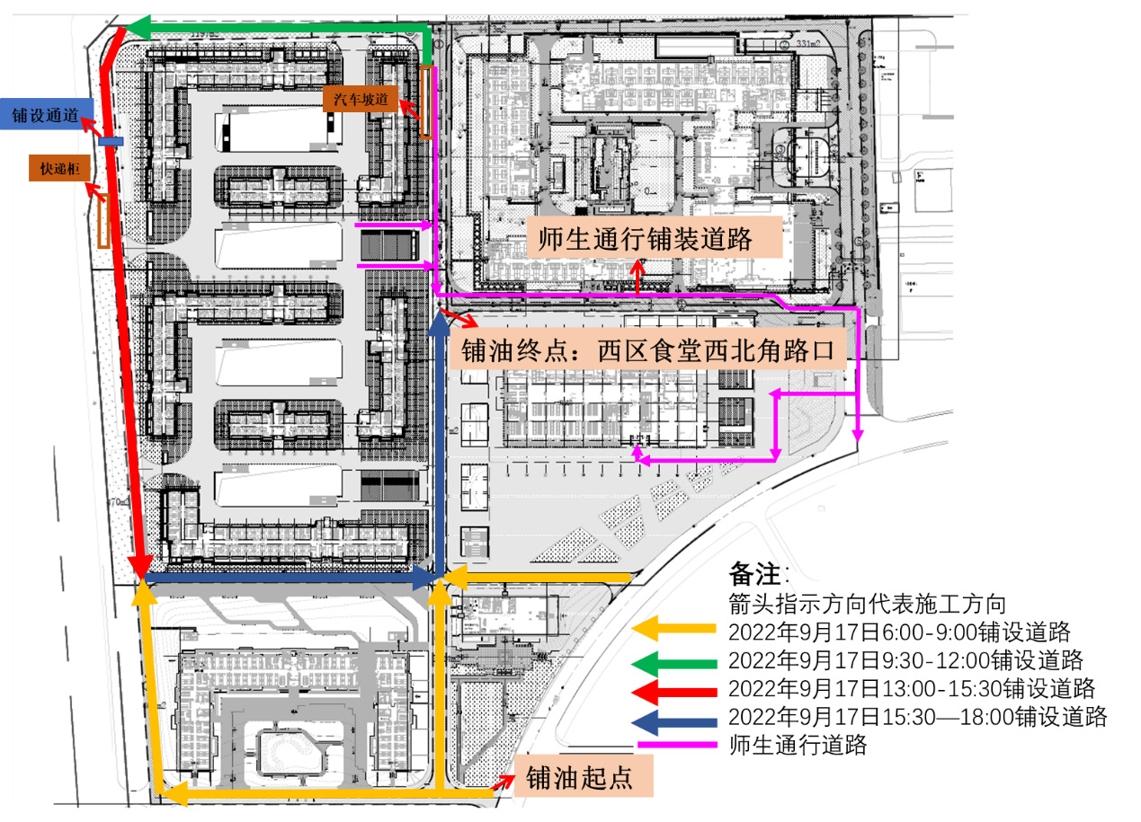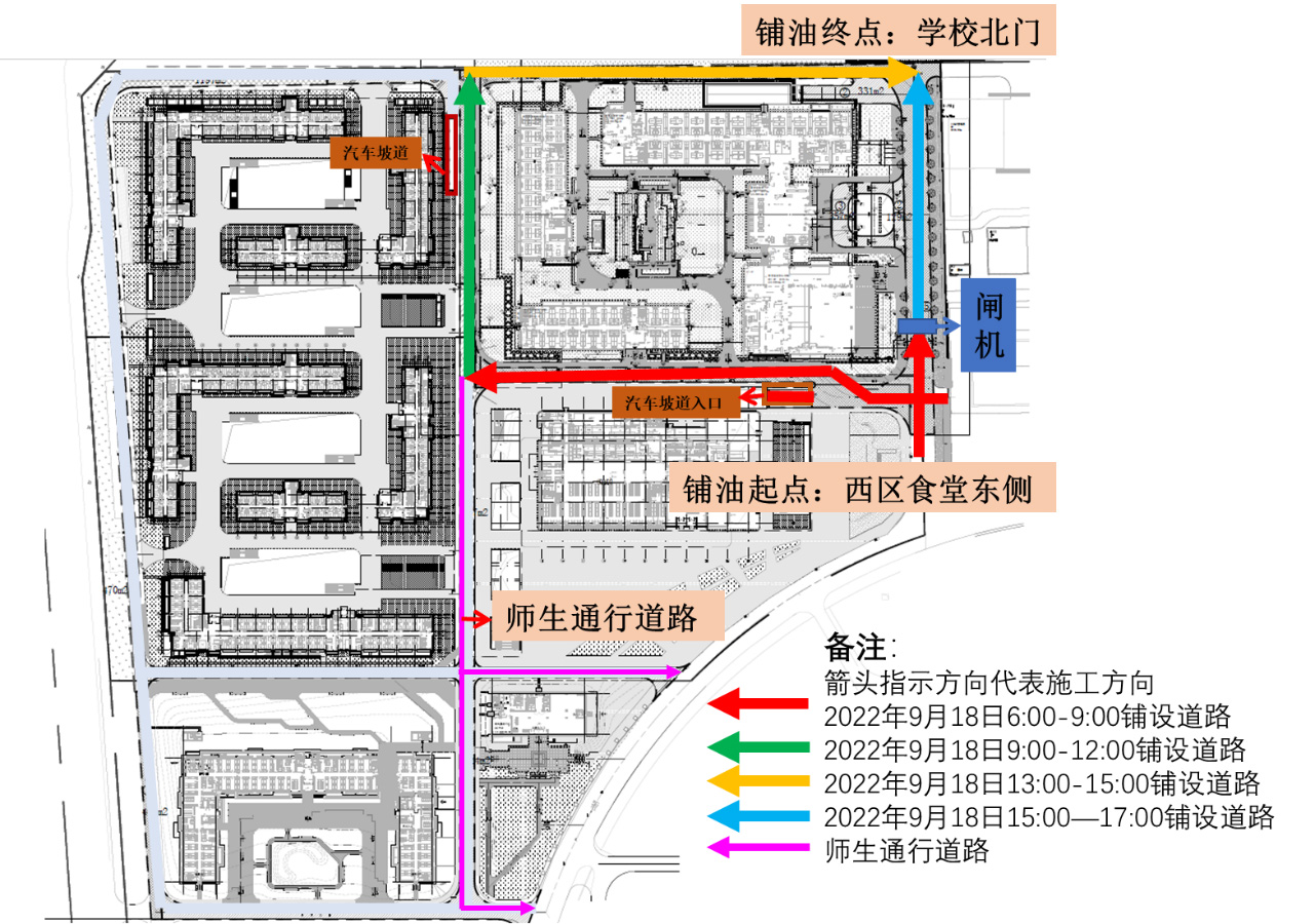 (2)2022年9月17日至18日,进行路面铺油施工,其中,9月18日6:00-24:00临时封闭西区地库出入口及北门,师生及通勤人员当日可从南二门进校。9月19日,西区地库出入口及北门恢复正常通行。
