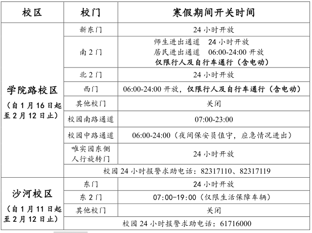 为做好2023年寒假期间校门管理工作,经学校研究决定,学院路校区、沙河校区校门开关时间调整如下: