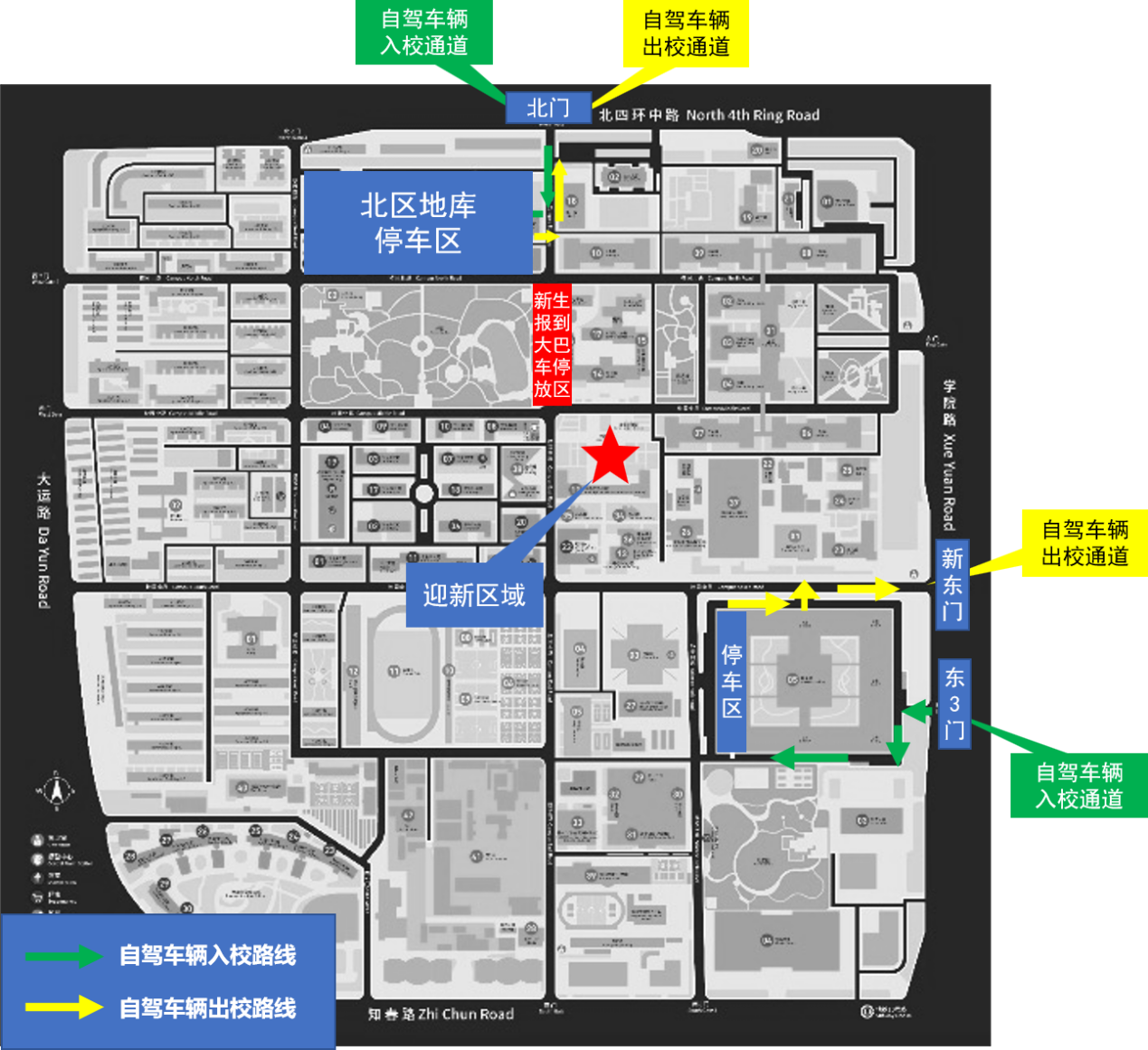 2.新生报到自驾车辆由东3门、北门入校,由新东门或北门出校。东3门进入的新生报到自驾车辆,沿新主楼内环向南围绕新主楼驶入新主楼西侧临时停车区依次顺序停放,车头向北,请配合现场人员指挥,由新东门出校。北门进校车辆进入北区地库停放,北区地库东口驶出的车辆由北门出校。