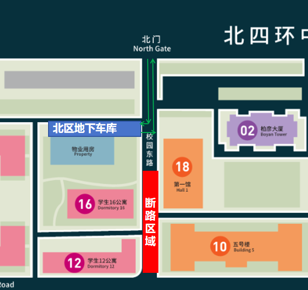 2.断路期间,学校北区地下车库正常开放,机动车可经北区地下车库进出校园。为方便出行,建议断路期间机动车通过学校其他大门进出校园。