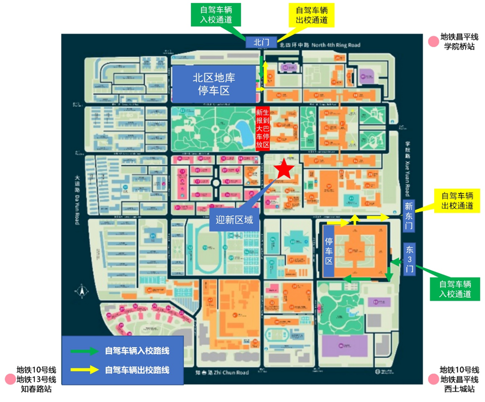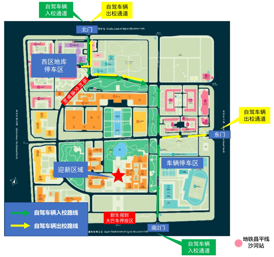 2.新生报到自驾车辆由南2门或北门入校,由东门或北门出校。除体育馆北侧停车场和西区地库外,指定路线沿线路侧可临时停车,请配合现场人员指挥。