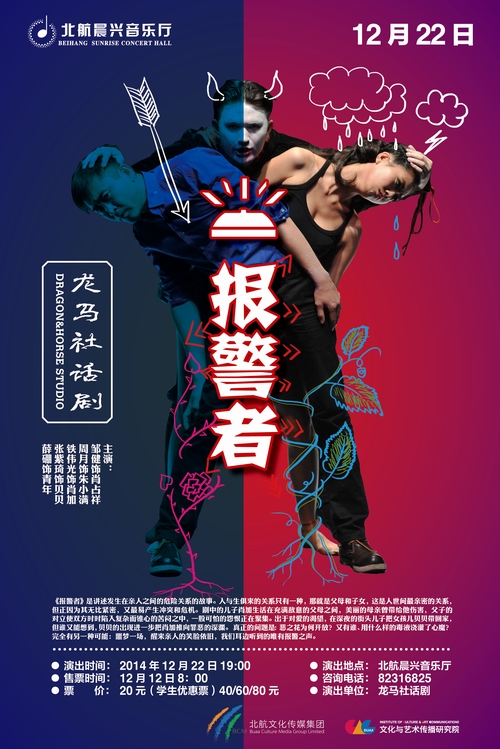 《报警者》是龙马社出品,集合了编剧万方、导演苏蓬、制作人王明辉,演员邹健、赵倩、付瑶、骆佳、铁伟光等共同创作的话剧作品,是2011 年底的话剧舞台上最受关注的本土原创剧目。戏剧大师曹禺之女、著名作家万方担任编剧,其子苏蓬担纲导演。这是母子二人继话剧《有一种毒药》引起轰动之后的第二次联手。讲述了发生在亲人之间的危险关系的故事。以危机四伏的现代亲情为题材,探究父子之间天生的对立与仇视,直面叛逆心灵的边缘成长之路,为世人敲响警钟。
