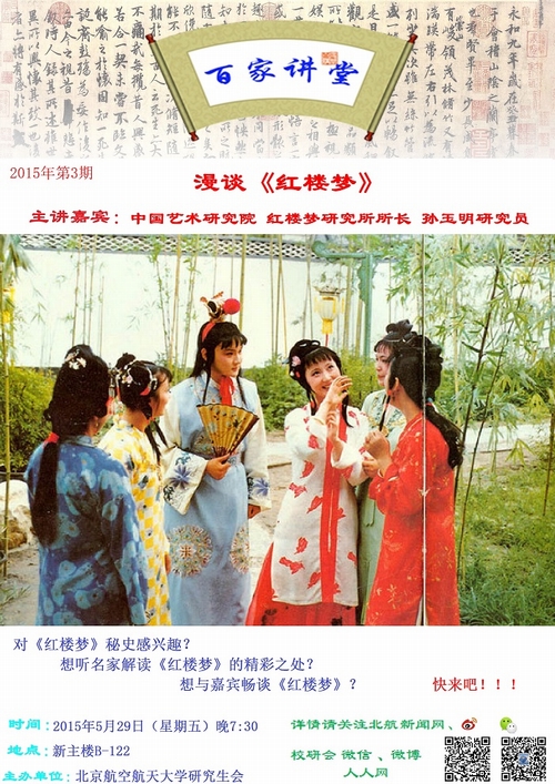 “百家争鸣、百花齐放”,校研究生会学术部主办的“百家讲堂”本期特邀中国艺术研究院研究员、博士生导师、红楼梦研究所孙玉明所长,与同学们分享妙趣横生的《红楼梦》,现场还可与嘉宾畅谈《红楼梦》,欢迎各位同学前来聆听!