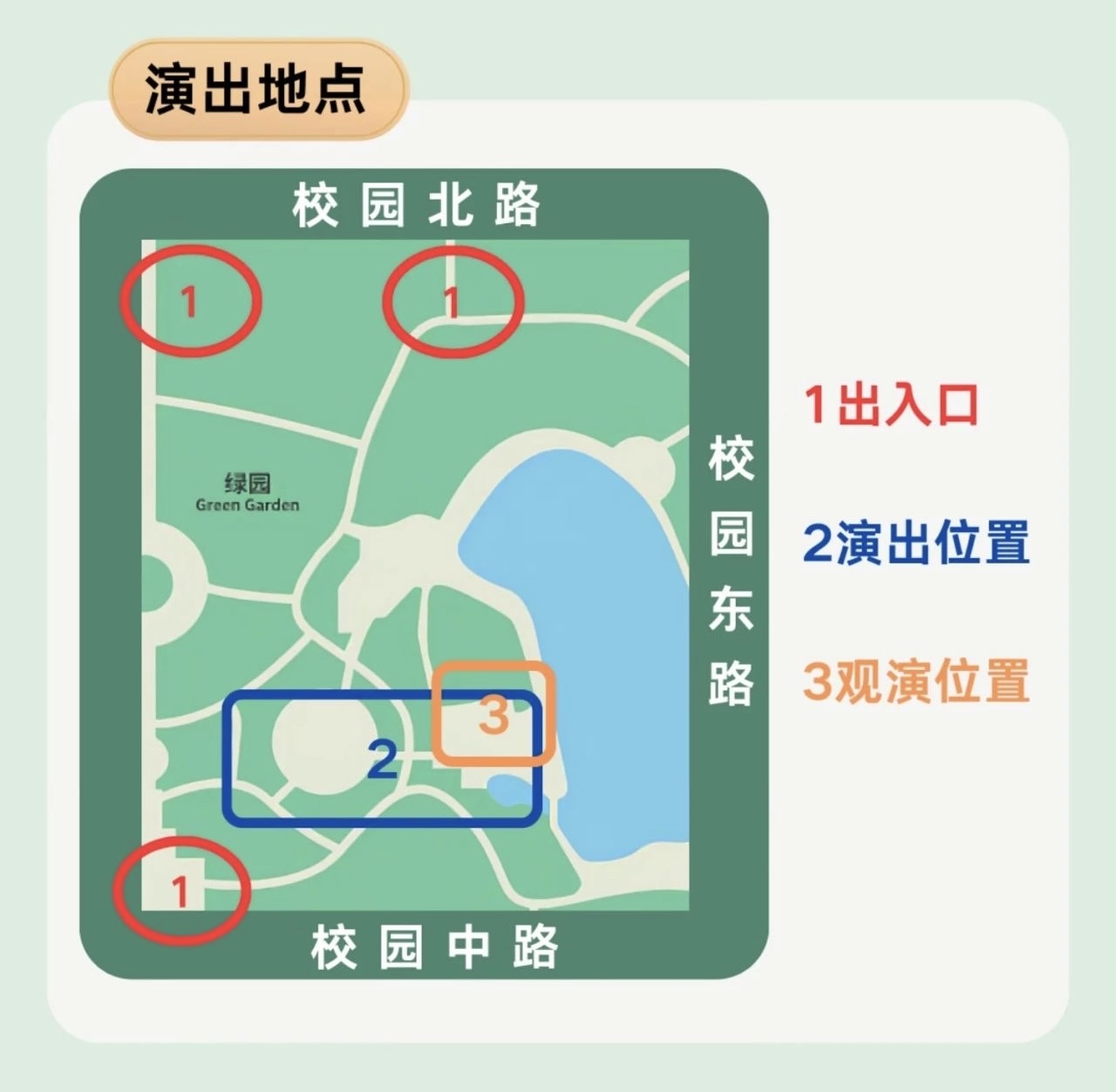 观演入口为绿园北门、南门,请各位观众朋友们有序进场,道路较窄,请务必保证安全。