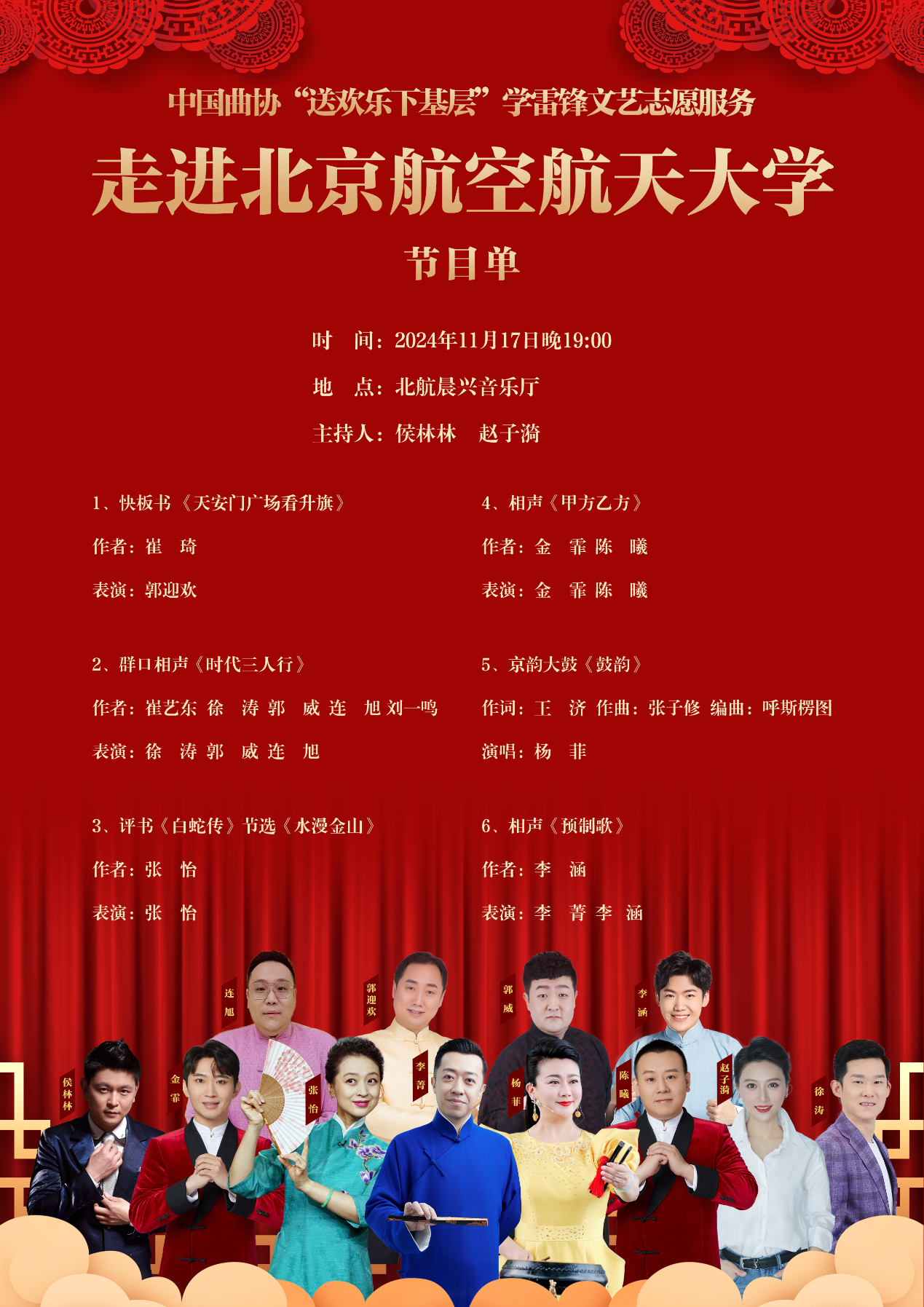 今年是中华人民共和国成立75周年,也是习近平总书记主持召开文艺工作座谈会并发表重要讲话10周年。为深入学习贯彻习近平文化思想,大力弘扬社会主义核心价值观,团结引领广大曲艺工作者深入生活、服务人民,中国曲艺家协会组织曲艺名家新秀来我校开展文艺志愿服务演出活动。
