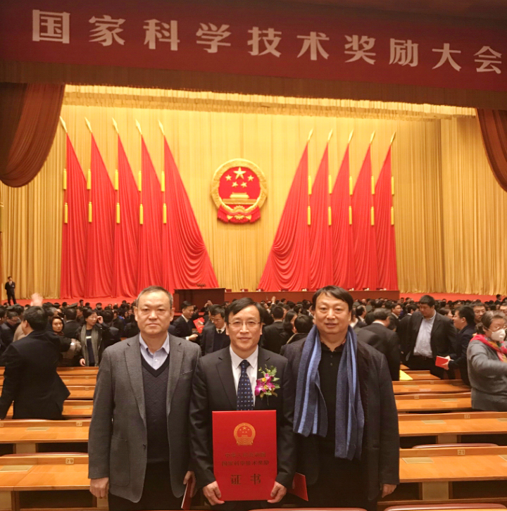 1月8日,陶智(中)与团队成员徐国强(左)、丁水汀(右)在国家科学技术奖励大会现场
