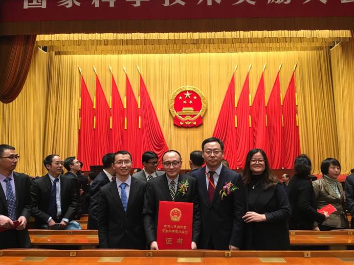 北航获奖者在2018年度国家科技奖励大会现场(中为施闯)