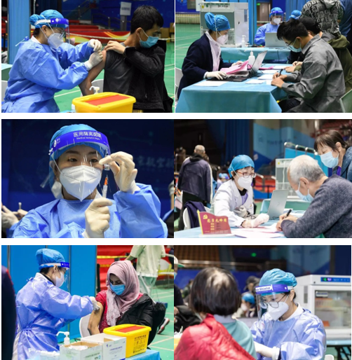 每天的接种工作都是紧张有序而忙碌的,每名医生要进行多次知情同意告知,面对咨询耐心讲解,消除师生居民的疑虑。3月28日,首位到达接种现场的外籍教师来到卢艳医生所在的7号台,她已在短时间内掌握外籍师生接种流程,从容地阐明知情同意内容,一整天下来,没有一刻喘息休息的时间。护士们日均可以完成300余剂次接种,最快的时候达一分钟一人次,从起瓶盖、抽药、消毒、排气、注射、拔针到最后的按压,所有动作一气呵成。王淑云护士创下单日440针的接种记录。