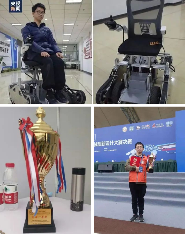 为了一位因高位截瘫坐轮椅的学长,他发明了一款“自动爬楼轮椅”。刘鑫说:“因为自己淋过雨,所以想给别人撑把伞”,这项发明在全国大赛中获得一等奖,并被授予国家发明专利。