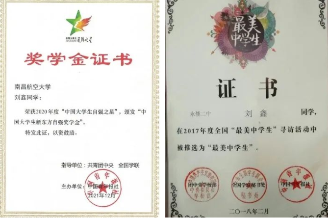 2020年度中国大学生自强之星、2017年度全国“最美中学生”