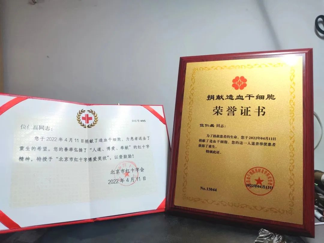 北京市红十字会为位仁磊颁发捐献造血干细胞荣誉证书,自动化科学与电气工程学院为位仁磊颁发“驭远之星”荣誉证书和奖章