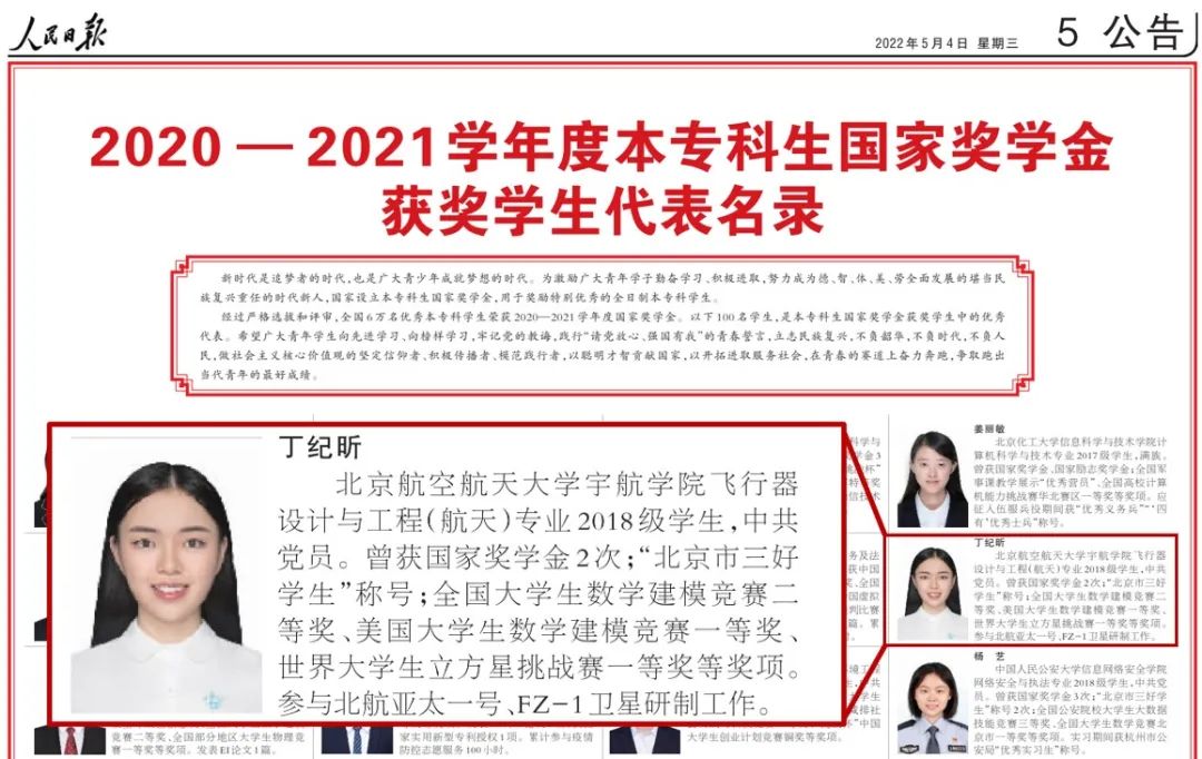 日前,人民日报公布了《2020-2021学年度本专科生国家奖学金获奖学生代表名录》,从全国6万多名国奖获得者中选出100名优秀代表,我校宇航学院2018级本科生丁纪昕荣列其中,彰显北航学子学研风貌,展示北航学子青春风采。