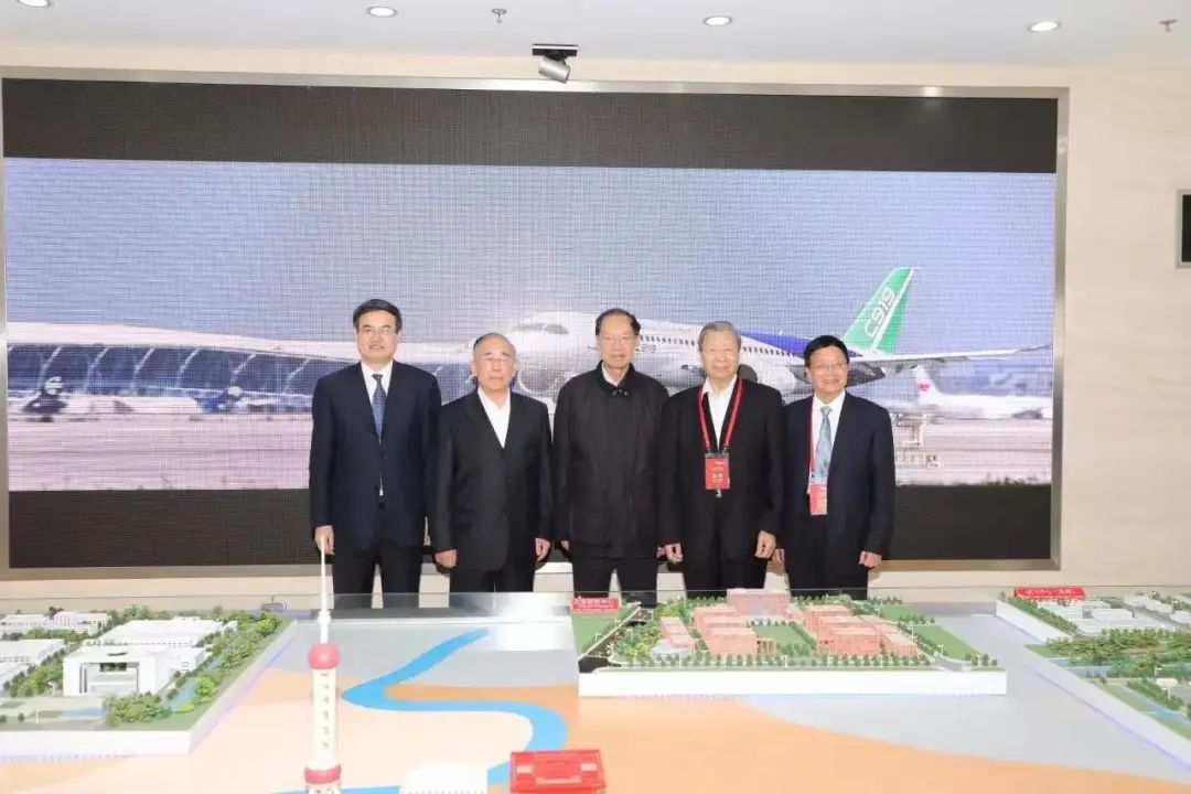 2017年5月,刘大响院士(右二)、李未院士(中)、冯培德院士(左二)、张军院士(左一)等应邀参加C919首飞仪式