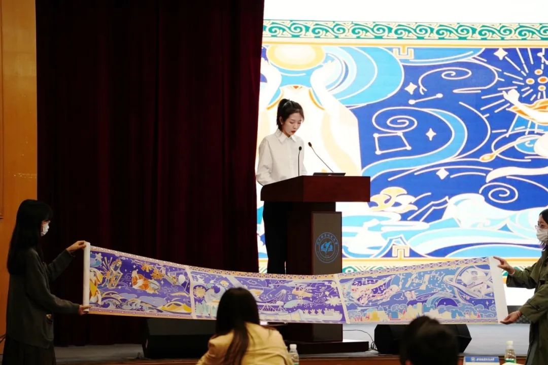2008年9月25日晚,神舟七号发射成功,举国上下万众欢腾的景象是我对航天事业的初印象——是直插云端的震撼,是浩瀚宇宙的神秘,是勠力同心的民族力量。数载时光,我逐步加深了对北航的热爱,增长了空天报国情怀,并渴望为其薪尽火传贡献自己的力量。我通过绘制巨幅航空航天历史卷轴,深情讲述航空故事,描绘航天底蕴,作品获得一等奖并入选由北京市委教育工委和中央美院主办的“行走京华大地·感悟思想伟力”主题展,作为优秀学生代表参加颁奖,获北京卫视报道。此外,我还以满腔热忱,投身学院献给北航70周年校庆的“北京一号”主题系列出版物《空天报国志》的绘制;参与建党百年“空天报国”主题作品《观往知来心·互动向心历》设计。