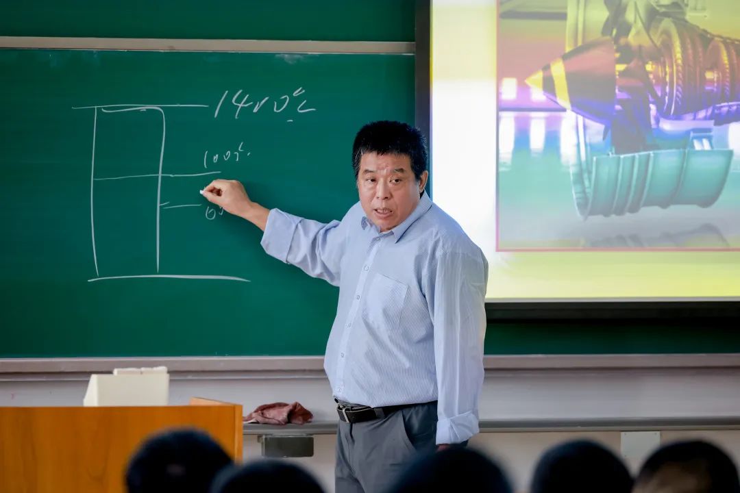 发梢稍白,衬衫西裤的穿搭,显得稳重而利落。讲台上,他随性踱着步子,不时用手中的激光笔翻阅着课件。他声音洪亮,从《论语》到《三体》,旁征博引、信手拈来,讲授航空发动机专业知识,有机融入空天报国情怀。课堂是井然有序的,还透着一丝轻松与洒脱,北航能源与动力工程学院洪杰教授正在给同学们上课。