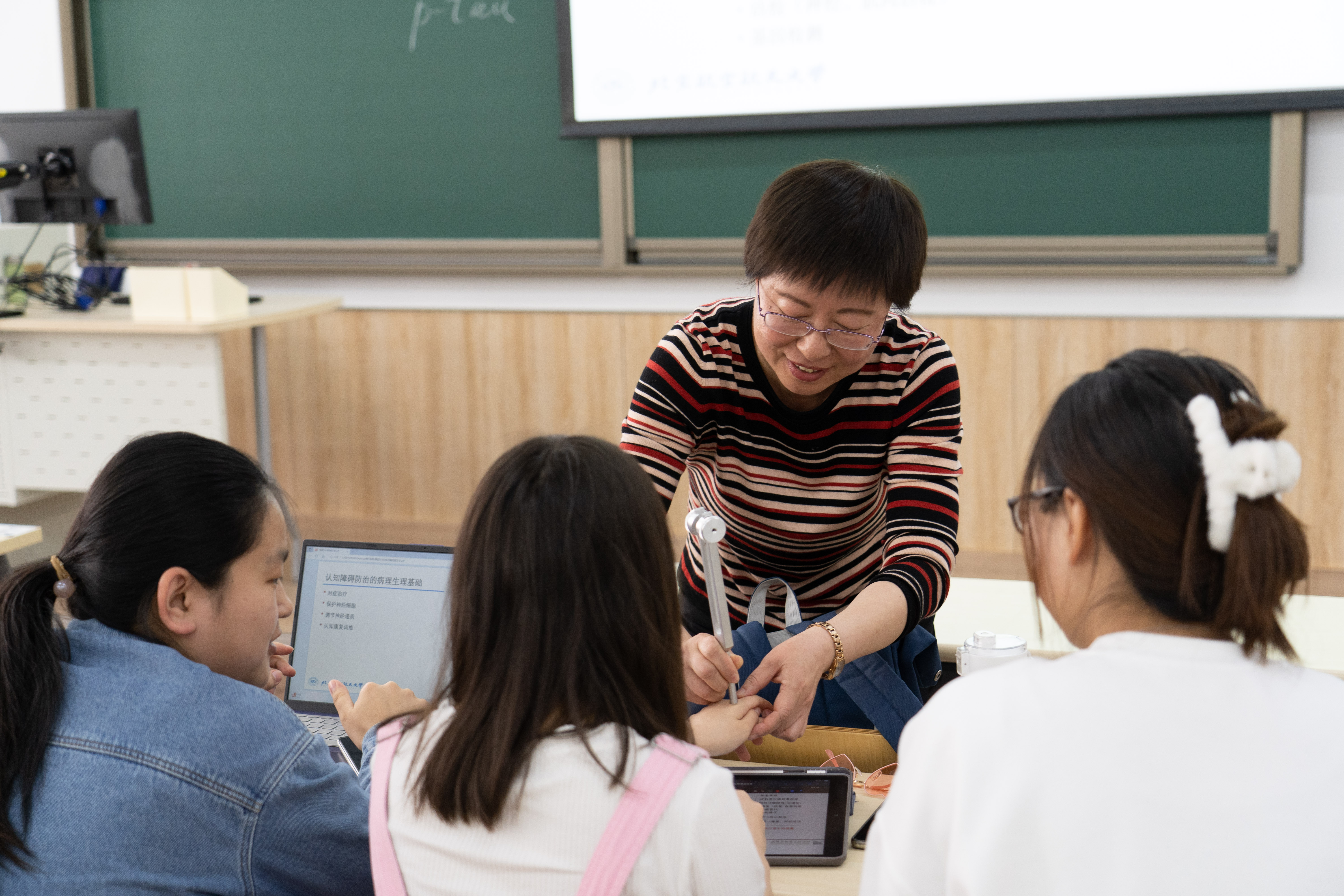 在教学过程方面,桑晨也有自己独特的设计。上课前,桑晨把拿来的叩诊锤交给学生们,在学生们好奇地使用叩诊锤的过程中,她简单介绍了叩诊锤的使用方法、用途和原理,欢声笑语间“剧透”了当天的讲授内容。课堂上,桑晨更是通过肢体模仿、教具演示等方式,从常见的病症讲起,由浅入深、循序渐进地带领同学们逐步认识各种病症,过程中自然地与相关工程部分课程进行“梦幻联动”,在为同学们打下扎实的医学知识基础的同时,也有利于同学们更好地进行医工融合的学习。