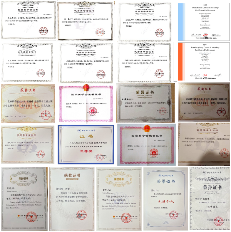 三年多的时间里,四人共获得包括国家奖学金(3人次)、校级特等奖学金(7人次)、中航技奖学金在内的奖学金共28项;获得包括士嘉奖章(院级最高荣誉)、北京市三好学生、优秀生(5人次)、校级三好学生(4人次)在内的荣誉称号共19项。