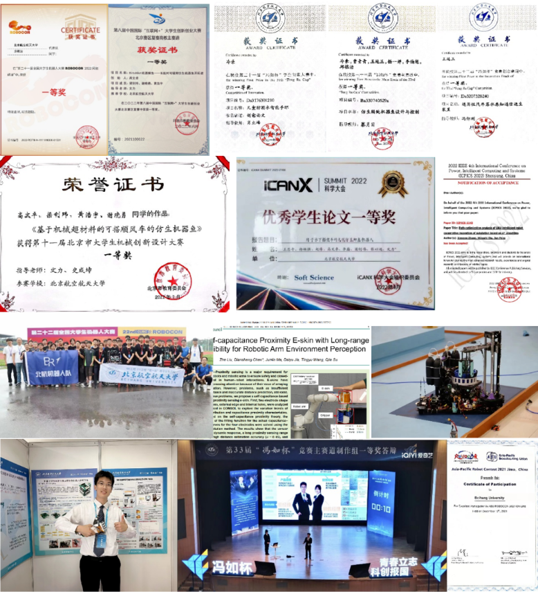 而在各类科技竞赛中,他们一起组队参与,获得过第三十三届冯如杯主赛道一等奖、中国国际互联网+大学生创新创业大赛北京赛区一等奖、全国大学生机器人大赛ROBOCON一等奖、首都挑战杯二等奖等奖项。