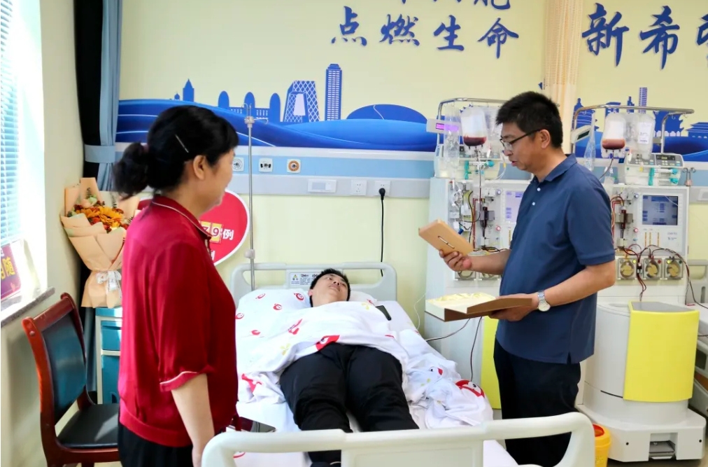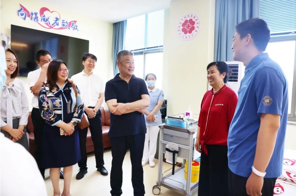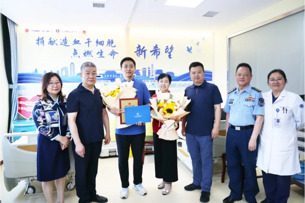 校党委书记赵长禄、副校长邓怡,市区红会捐献服务中心、空军特色医学中心、花园路街道、航发院领导、导师、辅导员、同学好友等来到采集室看望郝天顺,为他送上毕业祝福和温暖鼓励。