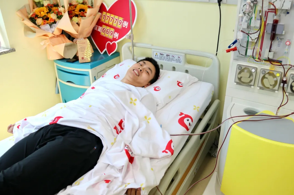 近日,在中国人民解放军空军特色医学中心的病床上,血液从郝天顺手臂缓缓流出,经过血细胞分离机的体外循环后,分离得到的造血干细胞将为另一个生命送去新的希望。