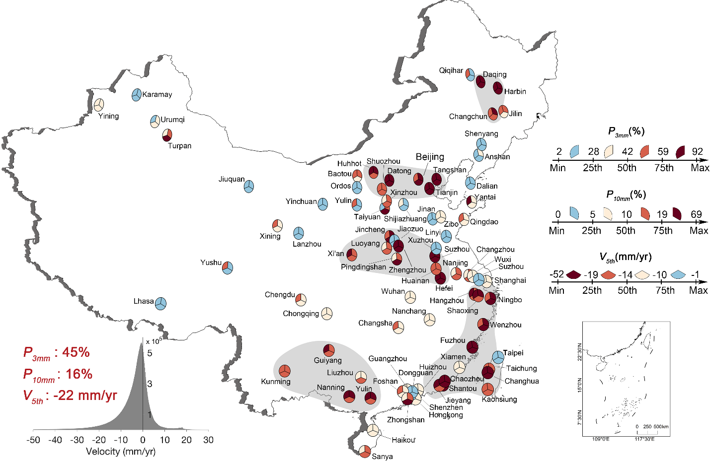 图1. 我国大中型城市地面沉降的格局。图中每个圆圈表示一个城市,圆圈的3部分分别为3个沉降指标:所有沉降区域的面积比例(P3mm),沉降速率快于1厘米/年的区域面积比例(P10mm),以及城市内部所有地区的5分位数沉降速率(V5th)。灰色部分圈出了沉降速率相对较快的5个城市区域。左下图显示了3个指标在全国尺度(即所有城市综合考虑)的统计值
