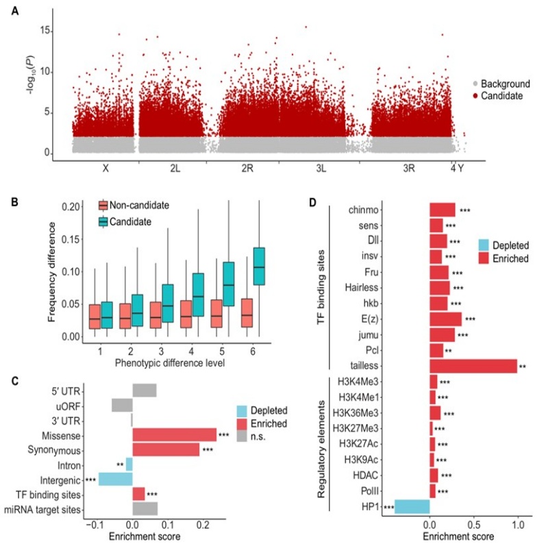 研究聚焦饥饿耐受这一与环境适应紧密相关的表型,使用群体箱对中国不同地点采集的200个黑腹果蝇品系开展了统一的表型筛选与混池测序。研究系统鉴定了与饥饿耐受相关的遗传变异,揭示了调控区域和蛋白质序列变化在饥饿耐受遗传架构中的作用,并结合RNA干扰和CRISPR/Cas9对候选基因进行了功能验证,发现约74%的候选基因表现出性别依赖的表型效应,其中12个基因还存在性别冲...