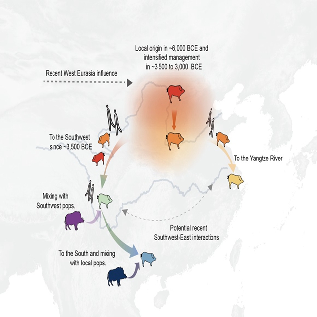 本研究追溯了中国家猪黑毛表型的起源与传播过程。结果显示,该表型最早出现在距今约5300年的北方家猪个体中。随着北方家猪驯化程度不断加深,黑毛表型被逐步固定下来,并随北方家猪的广泛传播扩散至全国各地。
