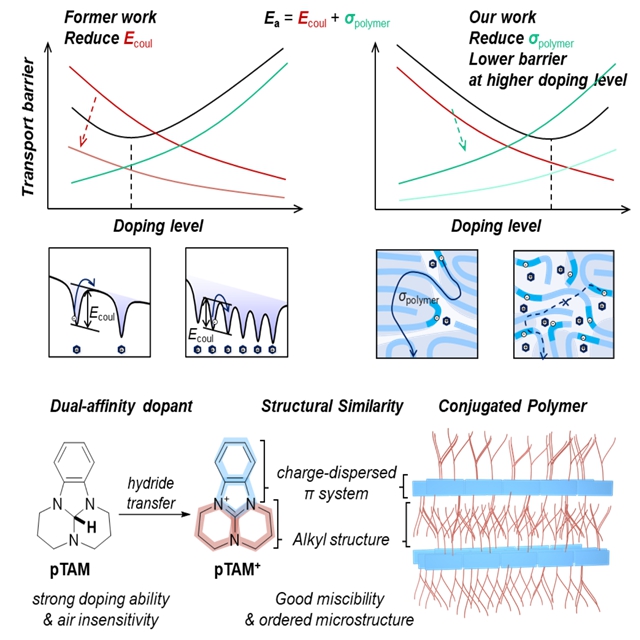 近日,欧美大片ppt免费大全化学与分子工程学院裴坚教授团队提出了一种两亲性掺杂剂设计策略,并基于此设计了具有共轭骨架-烷基侧链双亲和的n型掺杂剂pTAM。