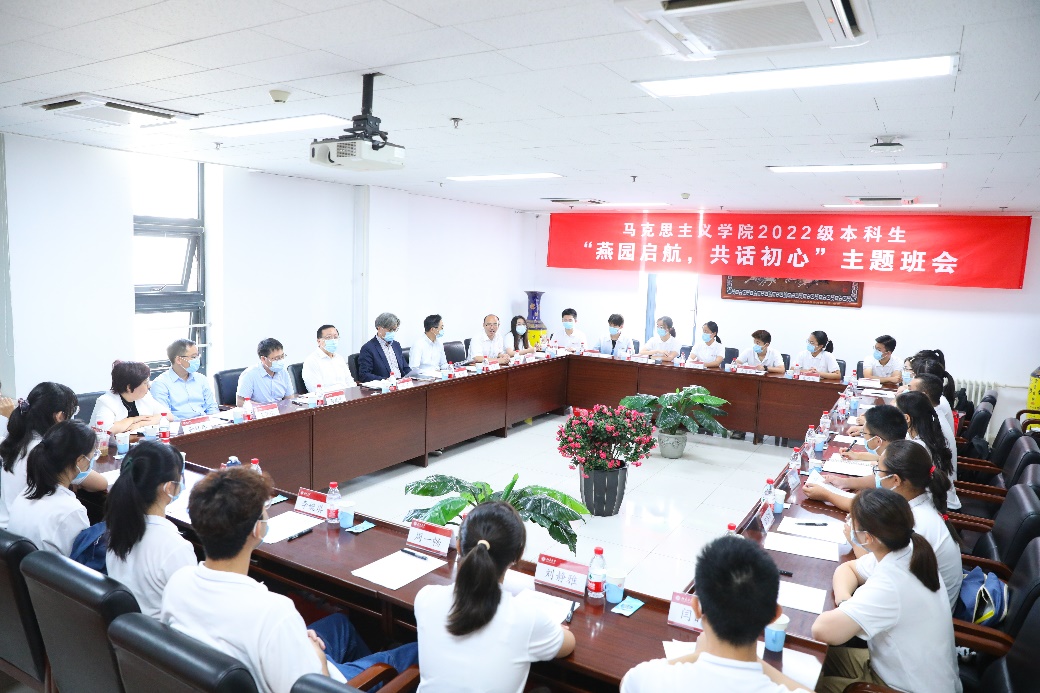 文字:张宁| 摄影:李香花| 编辑:山石 | 责编:知远2022年9月9日上午,马克思主义学院2022级本科生“燕园启航,共话初心”主题班会在理科5号楼301会议室举行。校党委书记、马克思主义学院2022级本科生第二班主任郝平,副校长、教务长王博,副校长、秘书长孙庆伟出席主题班会。班会由马克思主义学院党委书记孙蚌珠主持。