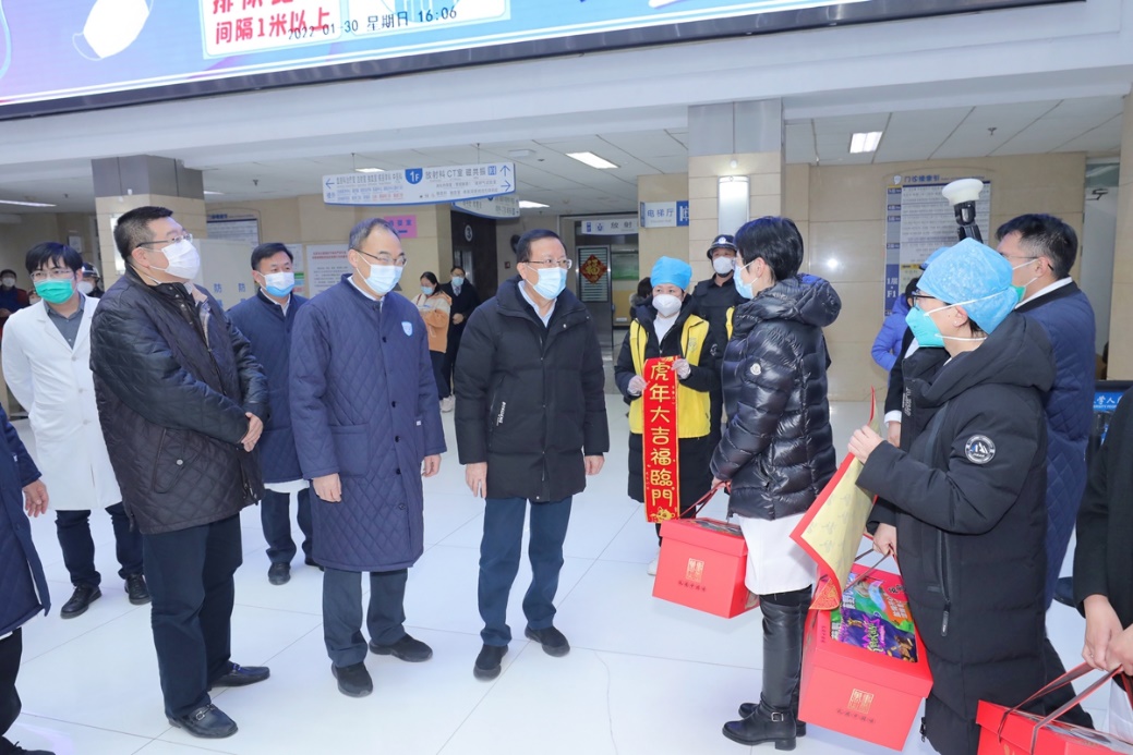 在人民医院门诊大厅,医生、护士、志愿者、引导员等一线工作人员仍然有条不紊地忙碌着,郝平一行与医院党委书记赵越、院长王俊等将新春慰问品和“福”字送到医务工作者手中。郝平希望医院新一届领导班子努力工作,把人民医院建设好。